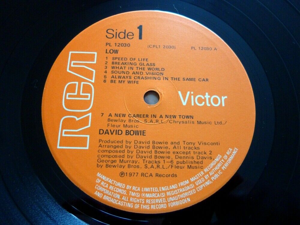 The uk first edition david bowie low has a cover that uses a modified version of the us cover the catalogue present in the top rh front corner of the us cover has been masked over artifacts are visible.